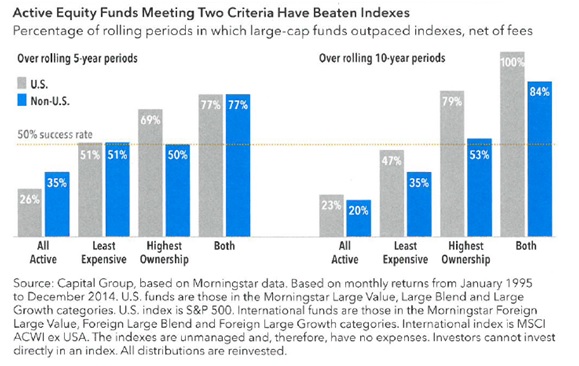 Capital Group shows in the study below that a simple selection of funds with lower fees and high manager ownership (see video) can greatly improve the chance of better performance.