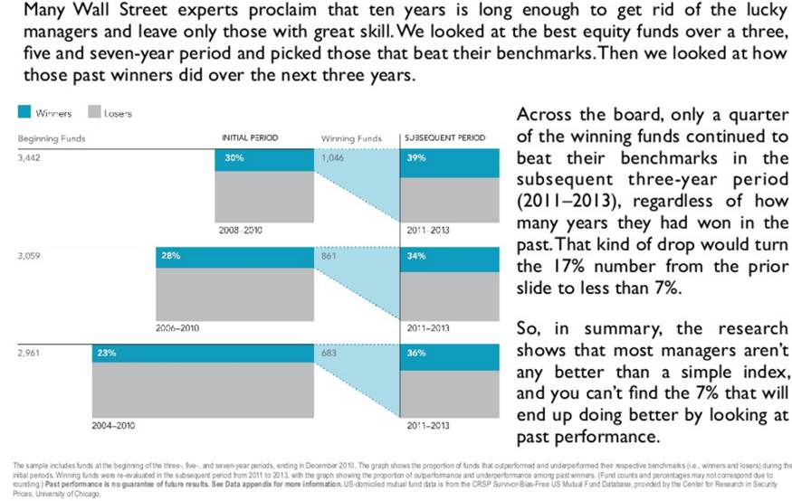 As you can see in the tables below, investors rely heavily on past performance in their fund selection process. The problem is that past performance is of little use in identifying funds who will deliver superior future performance. There is no significant correlation between past relative performance and future relative performance.